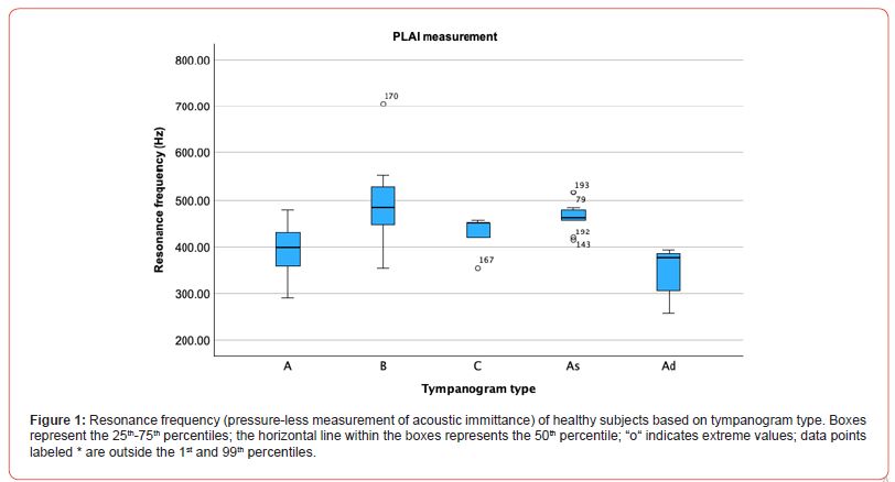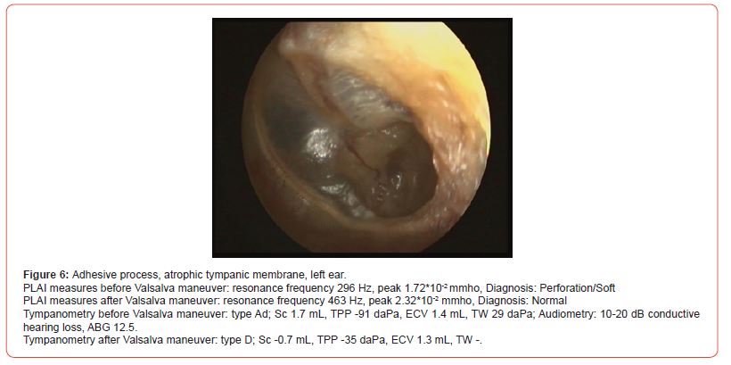 Results: Among the 37 ears with tube ventilation disorders (mesotympanic and/or epitympanic retraction, adhesive process, hyperectasis) without middle ear effusion, an average resonance frequency of 440 Hz ± 180.1 Hz (ranging from 161.5 to 1109 Hz) and an average peak of 2.00*10-2 mmho ranging from .62 to 4.41*10-2 mmho was determined. It was shown that a slight retraction of the tympanic membrane could lead to the PLAI diagnosis of “normal” or “soft,” while cases with fixation of the ossicular chain, confirmed by middle ear surgery, were diagnosed as “rigid.”