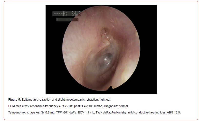 Figure 5 illustrates the findings of a patient with both epitympanic and mesotympanic retraction accompanied by mild conductive hearing loss. Tympanometric evaluation revealed an underpressure of