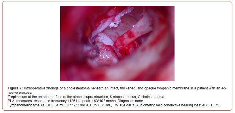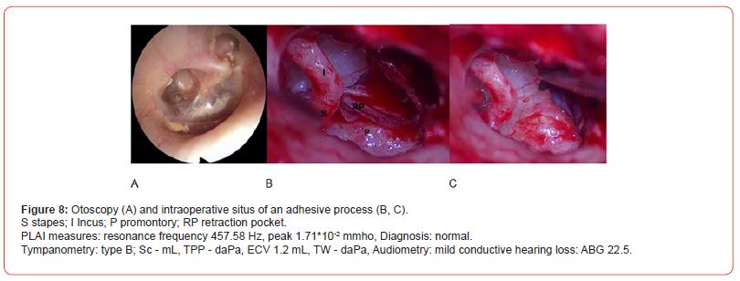 Figure 8A shows the otoscopic finding of an adhesive process. Pneumatic otoscopy revealed an attachment of the eardrum to the promontory. During surgery, adhesion of the tympanic membrane to the long process of the incus and the anterior surface of the stapes supra structure was found. The adhesive tympanic membrane was easily detached (Figure B, C). The ossicular chain was intact without fixation.