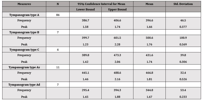 Of these, 86 out of 117 ears had a tympanogram type A (73.5%), 7 ears (6%) had a tympanogram type As, while 11 ears (9.4%) exhibited a tympanogram type Ad (Table 1). Tympanogram types B and C were found in approximately 5% of the normal-appearing ears assessed through otoscopy.
