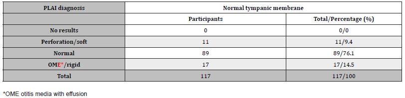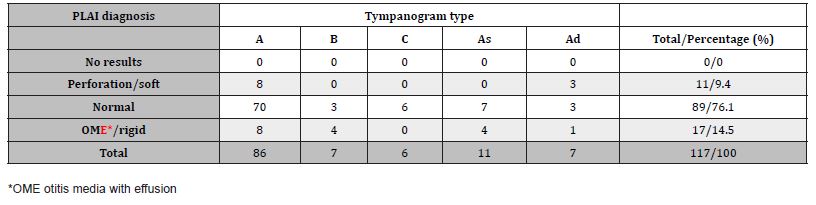 Considering tympanometry, 70 out of 117 subjects with a normal-appearing tympanic membrane had a tympanogram type A and a PLAI diagnosis of “normal” (60%) (Table 3).