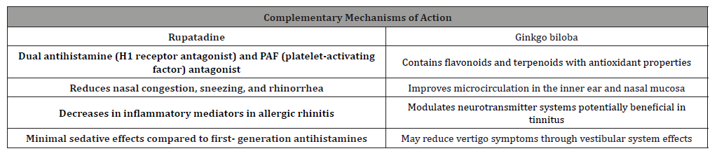 Vestibular disorders present another arena for possible synergy. Patients with chronic vestibular syndrome may have multifactorial etiologies – for example, age-related vestibular decline compounded by microvascular insufficiency and chronic inflammation. Ginkgo alone has shown efficacy in vascular vertigo and dizziness [10]. If allergic inflammation or histaminergic overstimulation (as seen in motion sickness or vestibular migraine) plays a role, rupatadine could contribute by stabilizing mast cells and blocking H1 sub> receptors, potentially reducing vertigo-related nausea or vestibular hypersensitivity [1]. Both drugs also have mild anxiolytic or neurotrophic benefits – rupatadine by improving sleep and reducing allergic discomfort, and Ginkgo by improving cognitive function and mood in some reports – which might together improve the quality of life in patients with tinnitus or vestibular disorders that often cause anxiety [9]. It is conceivable that in a patient with, say, persistent tinnitus with an anxiety component and microcirculatory deficits, rupatadine could alleviate any occult allergic contribution (like concurrent allergic rhinitis that can worsen middle ear pressure or tinnitus perception) while Ginkgo directly acts on the auditory system. Indeed, a trial combining Ginkgo with standard sound therapy for tinnitus indicated that the dual treatment was effective in reducing tinnitus severity [9]. Although that study did not include rupatadine, it exemplifies how Ginkgo can be paired with another modality to achieve symptomatic improvement.