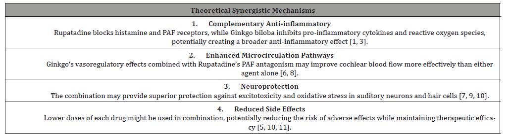 Pharmaceutical synergy refers to the interaction of two or more drugs that produce a combined effect greater than the sum of their individual effects. This concept is particularly valuable in clinical practice, especially in managing complex conditions such as those encountered in otolaryngology (ENT). One of the primary benefits of pharmaceutical synergy is enhanced efficacy. When drugs act on different but complementary biological pathways, they can more effectively address the multifaceted nature of diseases. For instance, in allergic rhinitis, combining an antihistamine with a vasodilator or anti-inflammatory agent [11] can offer more comprehensive symptom relief than either drug alone (Example: combining an antihistamine-Rupatadine with a vasodilator- Ginkgo biloba might more thoroughly address the multifactorial nature of allergic rhinitis). Another significant advantage of synergy is the ability to use lower doses of each drug while still achieving therapeutic goals. This dose reduction can decrease the likelihood of dose-dependent side effects, thereby improving the overall safety of the treatment regimen. In conditions that require long-term management, such as chronic rhinosinusitis or vestibular disorders, this approach becomes particularly beneficial.