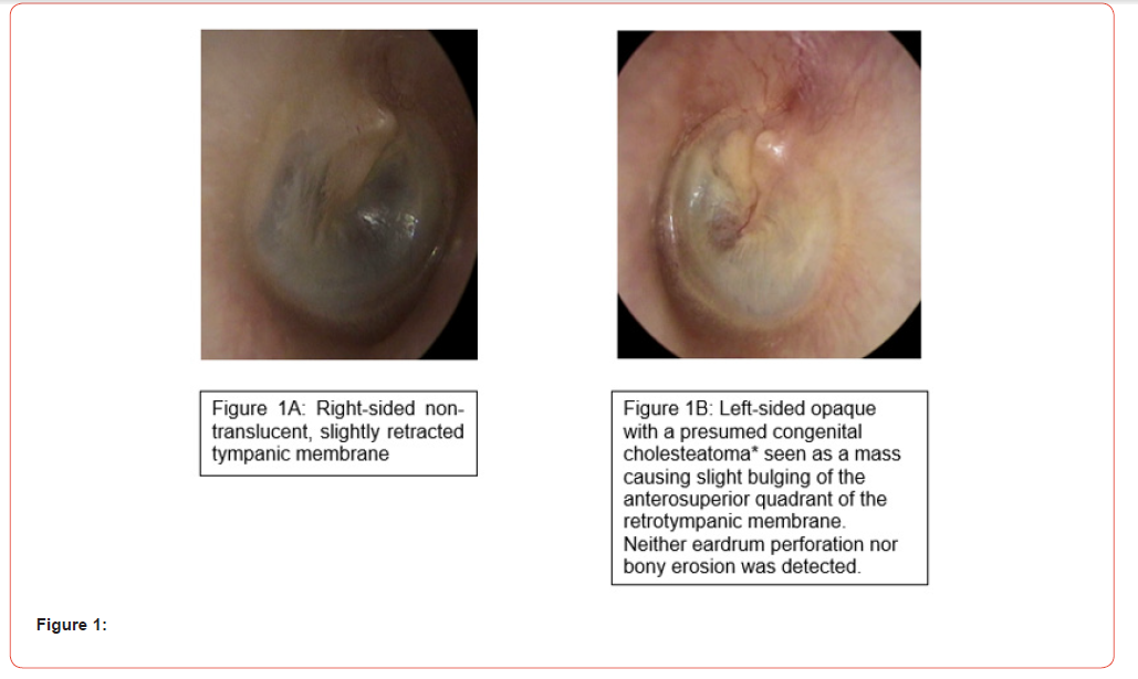 The otoscopic examination revealed medium-range ear canals on both sides. The right eardrum appeared dull, gray, and unremarkable. The left eardrum was intact but not translucent, with no mesotympanic or epitympanic retraction and without perforation with a mass causing slight bulging of the anterosuperior quadrant of the retrotympanic membrane (Figure 1).