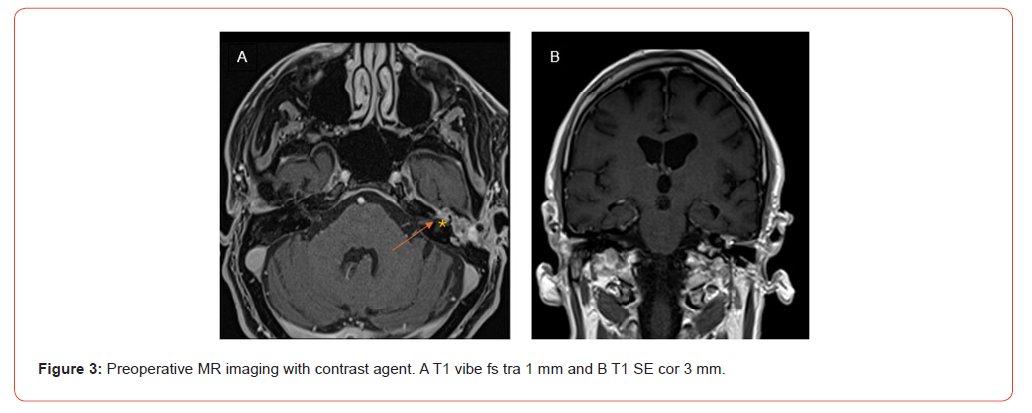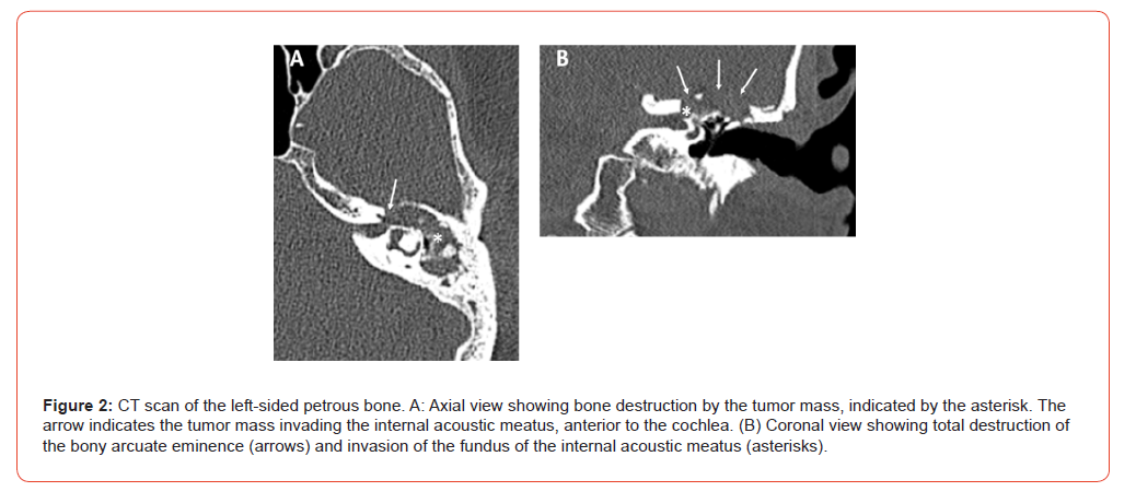 The patient underwent a preoperative high-resolution CT scan of the temporal bone (Figure 2A and B) and an MRT scan 1.5 Tesla (Figure 3). The preoperative CT scan of the head revealed a mass within the petrous bone on the left side (see Figure 2). This mass was found to be destroying the arcuate eminence and the underlying anterior semicircular canal, opening the middle fossa. From the most superior part, the tumor invaded medially into the fundus of the internal acoustic meatus and into the middle turn of the cochlea.