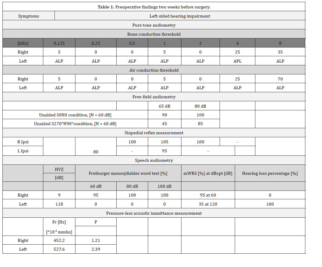 Using single-frequency 226-Hz tympanometry, a tympanogram type A was found in the right ear, and a flat curve (tympanogram type B) on the left side. Acoustic immittance measurements through the outer ear canal revealed a resonance frequency of the admittance of 452.2 Hz for the right ear and 527.6 Hz for the left ear. Video-nystagmography revealed no spontaneous nystagmus. The fistula test was conducted by increasing the external auditory canal pressure on the left ear, indicating a negative result, demonstrating the absence of pressure-induced nystagmus. The positioning test provoked nystagmus when turning the body to the left and right and when shaking the head. The clinical head impulse test indicated a corrective saccade, testing the lateral and anterior canals. However, the video head impulse test showed reduced VOR gains and catchup saccades in both lateral canals and the left posterior canal. The taste test revealed hypogeusia for all tested taste qualities on the left side tongue.