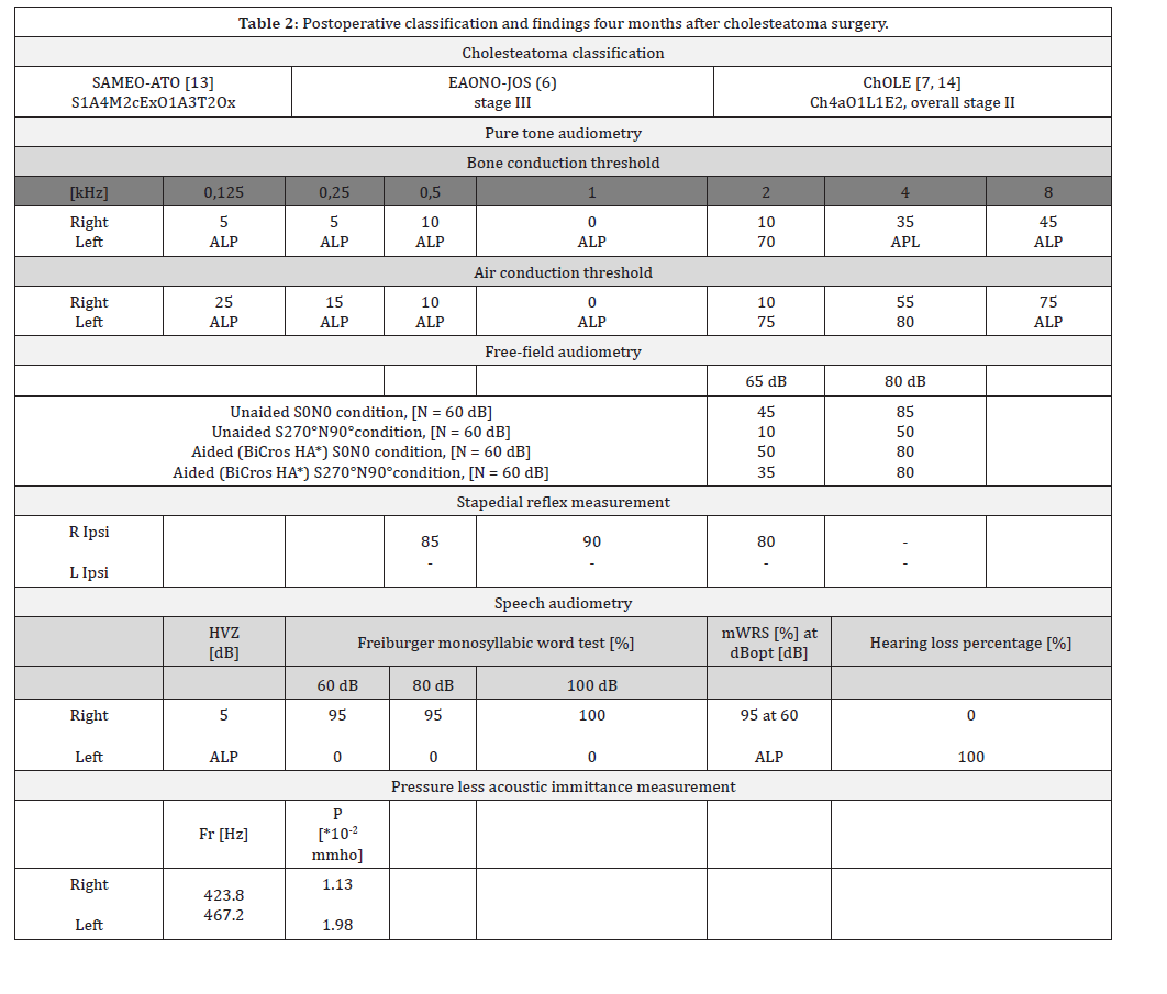 The residual hearing in the left ear that was present had disappeared postoperatively, and spatial hearing deteriorated (Table 2). According to the patient, the BiCROS hearing aid resulted in a slight improvement in spatial hearing. The dizziness symptoms have completely disappeared four months after the operation. Regarding the facial nerve function, the patient showed a slight improvement four months after surgery (HB VI to IV). A control MRI taken four months after surgery showed no cholesteatoma recurrence, no intracranial complications, and a fluid-filled inner ear.