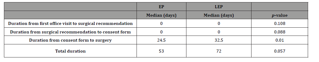 Given the data’s non-normal distribution and presence of outliers, results are presented as medians. The detailed findings are shown in Table 2. The median number of days from the first otolaryngology visit to surgical recommendation was zero in both groups (p = 0.108). The median number of days from surgical recommendation to signing the surgical consent form was also zero in both groups (p = 0.088). From signing the consent to surgery, the median was 24.5 days in the EP group and 32.5 days in the LEP group (p = 0.010). The total median days from the first office visit to surgery were 53 in the EP group and 72 in the LEP group (p = 0.057).