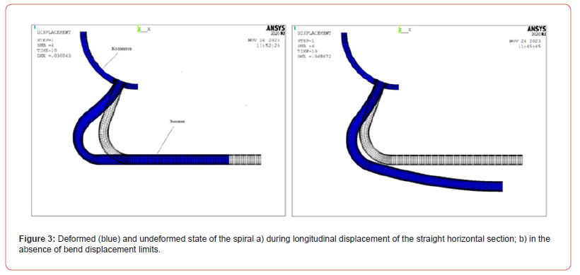 Figure 3a, b shows the computational study results of the damage caused to the tubes of the HRSG low-pressure evaporator heating surfaces outlet header. The calculations show that the tube bend cracks are caused by restriction of the straight tube section displacements in all directions except the longitudinal direction. The fairness of the solution adopted is confirmed by a sharp stress reduction in the bend, provided that there is no restriction of its displacements in all directions (Figure 3b).