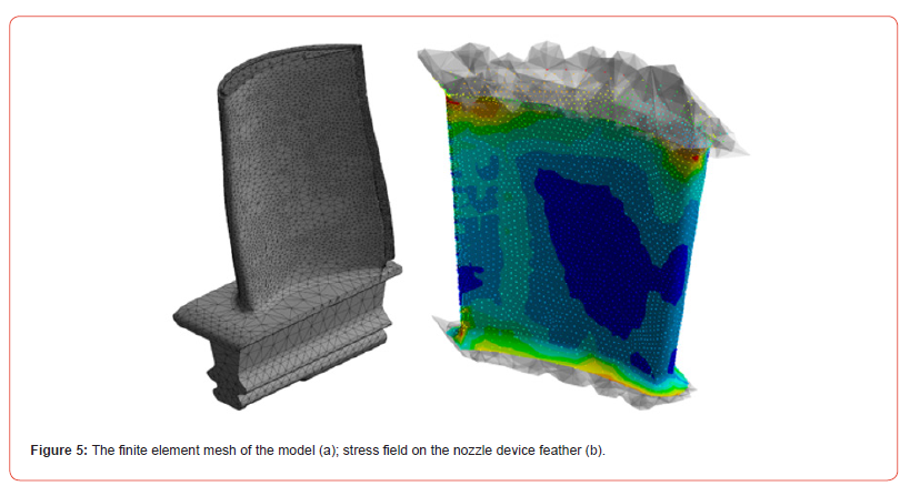Using a mathematical model of cooled gas turbine blades, it has been possible to estimate a gas turbine unit inter-service interval, both with and without a reduction in the upstream turbine gases temperature. The working blade finite element mesh is shown in Figure 5 (a). Numerical modelling is used to calculate the gas dynamics, temperature and strength of the nozzle and working blades. It allows the working and guide (Figure 5 b) blades stress-strain state to be determined most accurately and low cycle fatigue calculations to be performed. The correctness of the model construction and the accuracy of the calculations performed have been confirmed experimentally.