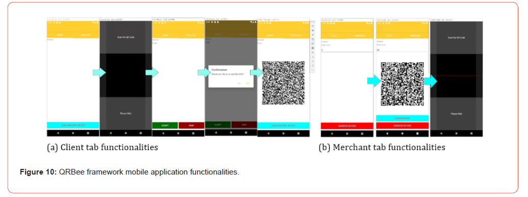 The QRBee framework is implemented on an Android mobile app for experiments, and the main use interface consists of two tabs, Client and Merchant (Figure 10). Each tab plays its own role and corresponds to the transaction based on the FTM sequential steps. Figure 10.a shows the Client tab functionalities, and Figure 10.b shows the Merchants tab functionalities. In practice, the mobile phone camera should be enabled/allowed for the QRBee model to proceed, and then, register into the QRBee framework by clicking the “Register” button.
