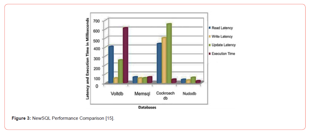 SQL database systems have been used for Online Transaction Processing (OLTP) since the emergence of the internet, but in modern database systems, NoSQL have gained more grip because NoSQL/unstructured databases provide better performance, especially in handling big data. In Ohyver et al. [14] study, NoSQL Firebase database engine compared to MySQL database, which results based on overall Create, Read, Update, and Delete (CRUD) operations that Firebase Realtime Database shows better performance relatively than MySQL Database. Conversely, the Kaur and Sachdeva [15] study introduces the NewSQL term as follows: “NewSQL is a class of modern Relational Database Management Systems (RDBMS) that provide the same scalable performance of NoSQL systems for Online Transaction Processing (OLTP) readwrite workloads while still maintaining the ACID guarantees of a traditional database system”. The work compares the performance of VoltDB, MemSQL, CockroachDB, and NuoDB. Figure 3 shows the comparison of NewSQL performance results.