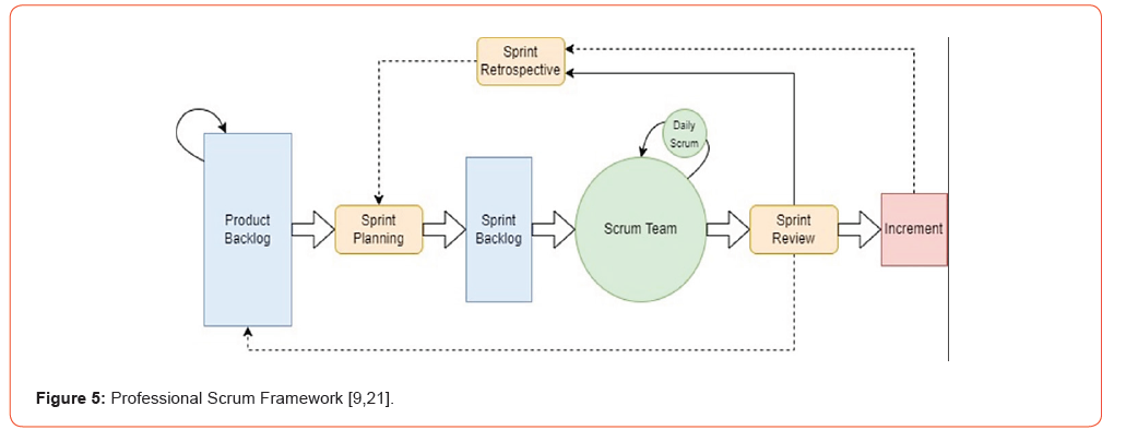 Practically, software developers and system architectures have multiple Agile methods, which are used to support and complement the Agile philosophy. Agile methods, such as Test-Driven Development (TDD), Feature Driven Development (FDD), Extreme Programming (XP), Scrum, Dynamic System Development Model (DSDM), and Crystal, etc., in general have their advantages and disadvantages, life cycles, and roles [22]. Indeed, there are several methodologies built using principles of Agile in mind, and one of them is formally known as Professional Scrum Framework (PSF) and generally as Scrum, see Figure 5 for details of the PSF process [21-23]. According to Scrum.org [9], Scrum has been described “as a way to get work done as a team in small pieces at a time, with continuous experimentation and feedback loops along the way to learn and improve as you go”.