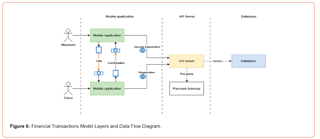 The Financial Transactions Model (FTM) has been designed based on three layers, which are the mobile application, Application Programming Interface (API) server, and the database, see Figure 6 [24]. The mobile application layer is used to make transactions for both the client (payer) and the merchant (trader) actors [25]. The API server layer is used to manage the application functionality and make the required database queries using NoSQL database engine, and the NoSQL database layer stores transactions and users’ data [26-28].