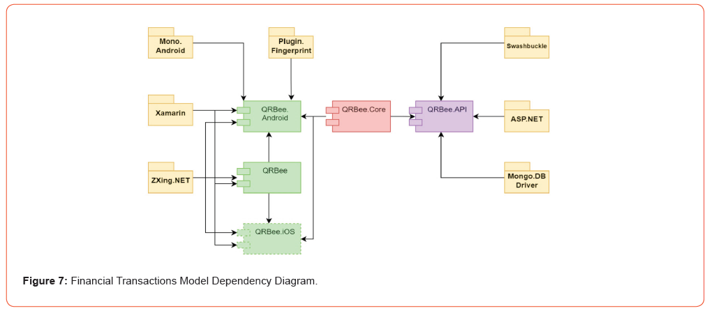 Both Client and Merchant interact with the mobile application model that functions using their role (Figure 6). Hence, the Client can register by accessing the API server, and then the transaction can be confirmed without internet access to the API server. While Merchant can register, initiate a transaction, receive a confirmation from the Client, communicate with the API server, and receive approval of the transaction. The mobile application model generates and scans QR codes to perform secure communication through a server using Microsoft Xamarin and C# for the .Net and the API server handles the connection logic [10]. NoSQL MongoDB database engine is used for the connection logic due to its superior performance, resilience, and comprehensive reporting capabilities [26]. External libraries for the mobile Operating Systems (OSs) have been contained in an object called QRBee to build the FTM dependency diagram (Figure 7). These libraries make the payment system have cross-platform capabilities. The FTM consists of five modules, which are: