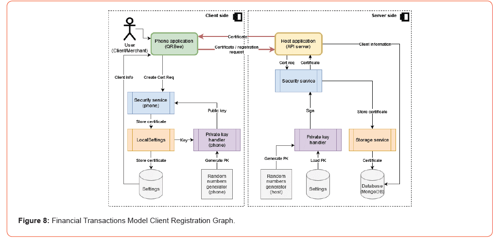 There are two main Client/Server communications implemented, see Figures 8 and 9. The first is the Client registration process to use the application, see Figure 8. The registration process is done with the use of private and public key encryption and self-signed certificates [29, 30]. For security reasons, private key generation with the use of a cryptographically strong random number generator must be performed at the point of ownership. Also, user (Client/ Merchant) keys should be generated on the app, while server keys must be either pre-generated or generated on the API server-side [31]. The API server acts as a Central Authority (CA), which issues self-signed digital certificates to users. The user certificate is used during the registration validity procedure, which only accepts certificates issued by the API server and assigns them to the users’ private key. Accordingly, if the user already exists, the certificate will be updated on the app; otherwise, the user’s self-signed certificate will be stored in the real-time database (MongoDB).