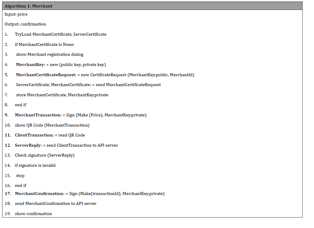 A financial transaction model was implemented and tested (Table 1). This FTM has sequential steps based on algorithms, which use QR codes to store encrypted data for a financial transaction, and the FTM steps were discussed in section 3.4. The FTM has three algorithms to implement the model’s sequential steps to process financial transactions [34]. Algorithm 1 describes the Merchants’ steps 1, 4, 5, and 8 of the FTM sequence process (Table 1), and also, the Merchants’ registration process and digital certificate assignment, if there is none in the QRBee framework.
