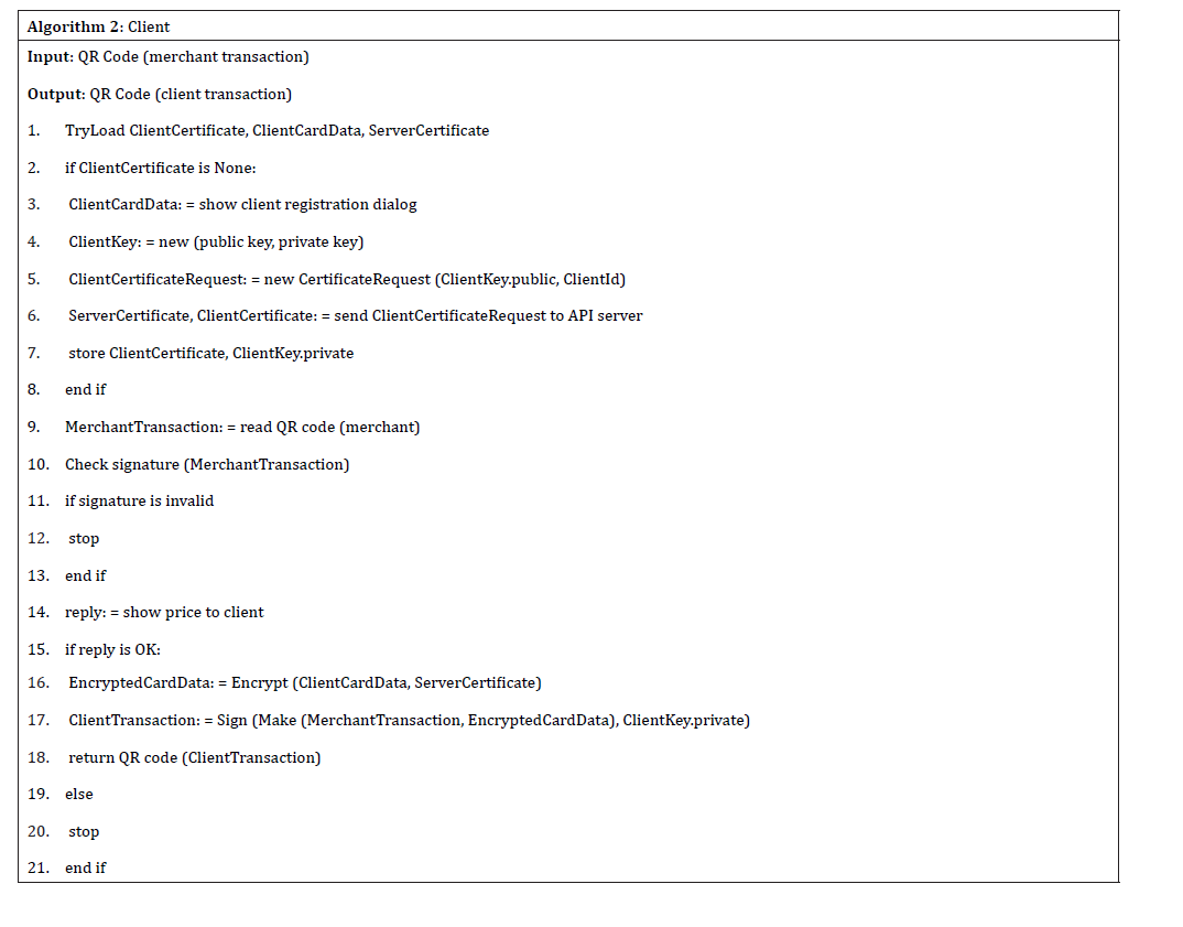 Algorithm 2 describes the Clients’ steps 2 and 3 of the FTM sequence process (Table 1) and looks at the Clients’ registration process and digital certificate assignment, if there is none in the QRBee framework. When the Client scans the Merchants’ QR code, the FTM checks Merchants’ signature and replies to the offer, and if either the Merchants’ signature is incorrect or the reply is negative, algorithm 2 terminates the financial transaction.