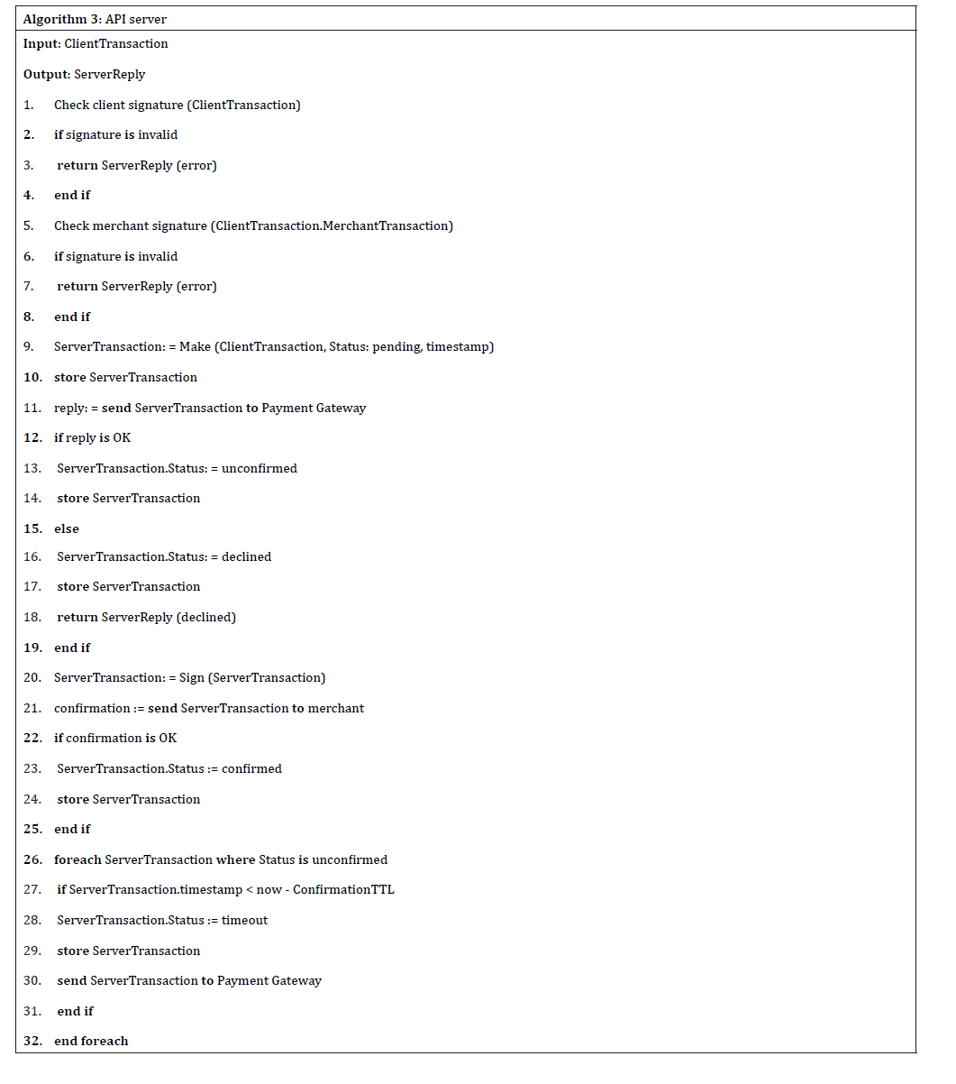 Algorithm 3 represents the API servers’ steps 6 and 7 of the FTM sequence process. In this algorithm, the API server checks the Client’s transaction data, including Merchants’ and Clients’ digital signatures, and if the transaction is appropriate, the data will be sent to the payment gateway, which responds back to the Merchant to confirm the transaction passes the check, so the transaction can be saved to the database with the “confirmed” status.
