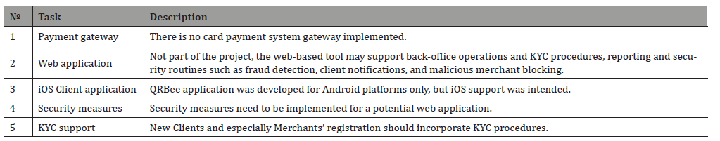 Furthermore, the QRBee system satisfied the research purpose, as it was able to handle financial transactions with the use of QR codes, but there are areas for further development, as listed in Table 2. This includes various tasks, which can be a base for further research studies. For instance, a research study can be used to delve deeper into the security aspect of the proposed QRBee framework and find a way to integrate it into different payment systems. The QRBee framework presents several notable tasks and considerations for enhancement (Table 2). Firstly, the absence of a card payment system gateway impedes the execution of real card transactions. Moreover, the web application, tailored for back-office support, lacks features for front-end operations but addresses essential functions like KYC procedures, reporting, and security measures, such as fraud detection and client notifications. Indeed, the QRBee developed application is exclusive to Android platforms. To fortify the overall system, there is a call for robust security measures encompassing both the mobile and potential web applications. Lastly, compliance with legal requirements mandates the incorporation of KYC procedures into the registration process, particularly for new Clients and Merchants.