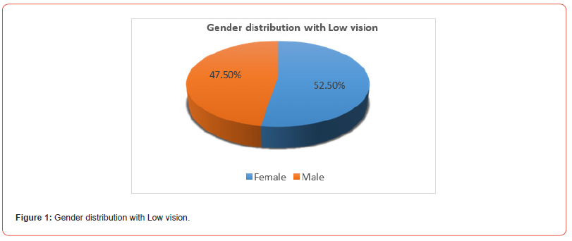 Our study included total 200 subjects to see the causes of low vision in these patients and difficulties. In which 105 (52.5%) were females and 95 (47.5%) were males (Figure 1). Female were more sufferings with low vision than male. Figure 1