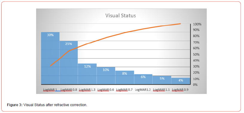 In this study, 145 (72.5%) had refractive errors and 81 (55.86%) were myopic. The mean refractive error was -3.50 (SD ± 4.15), and the range of better eyes was (-0.50 to -20.00 D). Their average visual acuity was 0.90 LogMar (sd ±0.21). Among these, about 64 (44.14%) patients were hyperopic mean refractive error +3.25 (SD ±3.83D) in the better eye with visual acuity of 0.95 LogMar (SD ±0.23) (Figure 3). The mean Visual Acuity Log MAR 0.95 (sd ±0.21) in the better eye with mode 1.00 logMAR; 30% had visual acuity 1.0logMAR and 25% had 0.80logMAR (Figure 3). Almost two-third of the low-vision patients seen had some amount of refractive error. Visual acuity can be improved by spectacle correction in many lowvision patients.