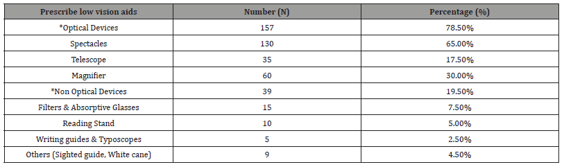 In this study, we prescribed optical aids about 157 (78.50%) and non-optical aids for 39 (19.50%). Patients who were visually impaired and had best corrected vision in their better eye <6/60, were given Visually Impairment Certificate from the BSMMU Low Vision Department. It’s about 35 (17.50%), and we referred them to the social welfare department for VI card. We issued letters to the school about 27 (13.50%) students who are studying currently and about 10 (5.00%) for students who are legally blind; we referred them to the school for blind education. We also referred them about 57 (28.50%) for orientation and mobility (O & M) training center to use their remaining vision and other senses to learn techniques and skills and survive in any environment for the rest of their lives.