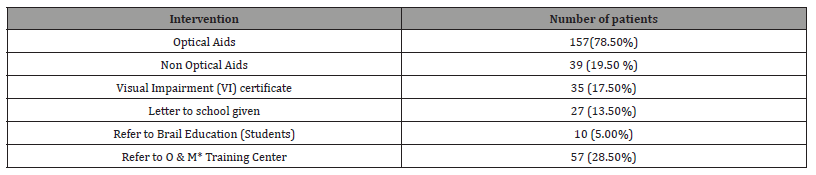 corelated with increasing age. We prescribed Optical aids 157(78.50%) and non-optical aids 39(19.50%). Interventions were mainly Spectacles,