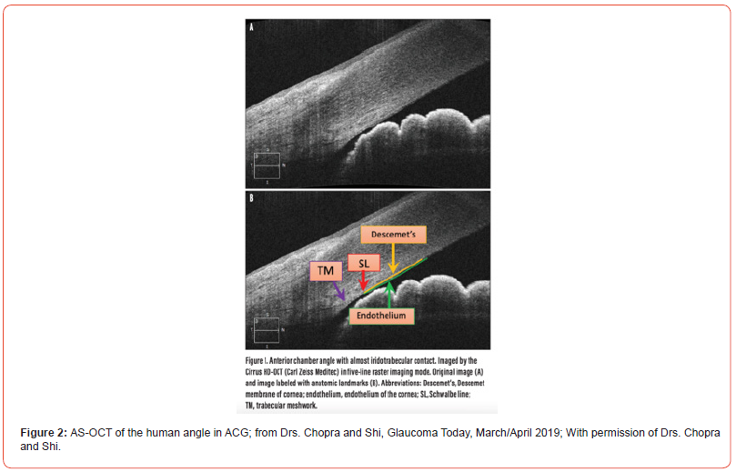 Anterior segment OCT (AS-OCT) was first reported in 2001 [12]. With a wavelength of 1310nm, it was optimized for examination of the iridocorneal angle, but because of its relatively higher cost and early lack of approval for insurance reimbursement, it was not initially well adopted in the US. However, several research studies and more recent data has demonstrated the clinical utility of AS-OCT, it’s reproducibility and role in delineating closed angle glaucoma See Figure 2 from Y Shi and V Chopra, Glaucoma Today, Mar/Apr 2019 [13].