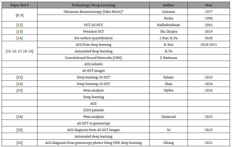 The Shan paper is reviewed in detail because it embodies the majority of the most current ACG measurement parameters, the application of SS-OCT imaging, and the use of CNN AI deep learning.