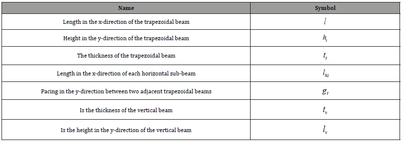 Figure 1 shows the unit cell of the proposed structure. The unit cell possesses parallel aligned vertical beams and trapezoidal beams between the vertical beams. The detailed geometry of the unit cell can be determined by the following parameters in Table 1. The following non-dimensional geometrical parameters are also defined to study the elastic properties of the structure: h = ht / l (height-tolength ratio of the trapezoidal beam), t = tt/l (thickness-to-length ratio of the trapezoidal beam), g = gt/l (spacing-to-length ratio of the trapezoidal beams), μ = lhs /l (horizontal sub-beam proportion ratio along x-direction), η = v t/tt (vertical beam to trapezoidal beam thickness ratio ), b = bt/l (cell depth-to-length ratio).