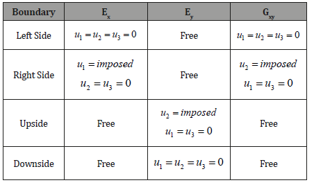 A three-dimensional model is created in the commercial soft package ABAQUS. 8-node shell elements are used in this study. In this paper, the non-dimensional geometrical parameters were fixed as h =1, t = 0.1, g =1, η =1. The non-dimensional equivalent elastic modulus in the x-direction, y-direction and shear modulus is defined as Ex/ E, Ey/E , Gxy/E respectively. The effects of the crack length and crack angle on the non-dimensional equivalent modulus are studied. The moduli E and Gxy are then obtained as the ratios between the averaged stresses and the imposed strains. The homogenized stresses are calculated by averaging the reaction forces along the direction of the imposed displacement over the boundary. The boundary conditions are listed in Table 2.