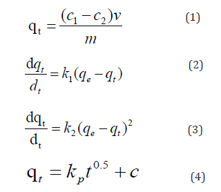 Where, qt and qe (mg /g) are the amounts of RhB adsorbed on the SDS/sepiolite at time t and at equilibrium, respectively. C1 and c2 are concentration of RhB before and after the reaction, respectively. K1, k2 and kp are adsorption rate constants in the pseudo-first and pseudo-second order and Morries-Wede equations.
