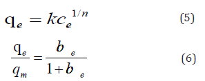 qe is theamount of RhB adsorbed (mg/g), ce is RhB concentration in equilibrium solution (mg/L).